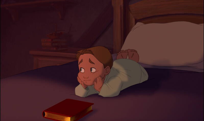 During the moving storybook sequence, we are introduced to the loot of a thousand worlds, the plunder of the space pirate Captain Flint. This enormous hoard is hidden somewhere on Treasure Planet, something the child, Jim, expresses a desire to find. Like I did when I was a child, when Jim is told to go to sleep by his mother he pretends to do so, then goes under his sheets to continue reading. He is so relatable, young, and innocent, and we can't help but like him. His excitement for Treasure Planet, the chaos and adventure that comes with such a treasure hoard, is what motivates him for most of the film.